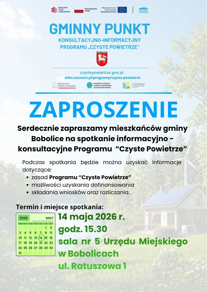 W Bobolicach szykuje się spotkanie, które może zainteresować każdego, kto planuje wymianę pieca albo poprawę energetyczną domu. 14 maja 2026 r. o godz. 15:30 w sali nr 5 Urzędu Miejskiego przedstawione zostaną zasady programu „Czyste Powietrze”. To właśnie tam mieszkańcy mają usłyszeć, na jakie wsparcie można liczyć i jak przejść przez formalności bez błądzenia po omacku.
