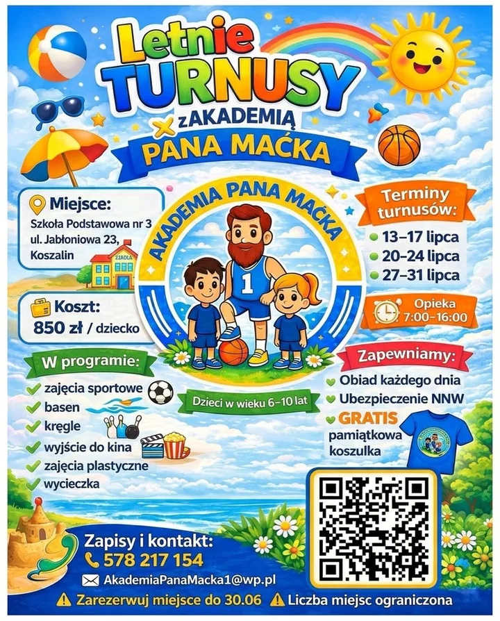 W Koszalinie szykuje się lato w wersji aktywnej, kolorowej i bez nudy Letnie turnusy z Akademią Pana Maćka to propozycja dla dzieci, które lubią ruch, nowe zajęcia i wakacje z planem na każdy dzień. Basen, kręgle, sport, kino, wycieczki i opieka od rana do popołudnia — brzmi jak opcja, którą warto sprawdzić, jeśli szukasz dla dziecka dobrze zorganizowanych wakacji.